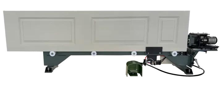 - A pneumatic clamp activated by a foot pedal holds the door securely in place while drilling for the ball catch.